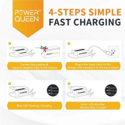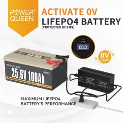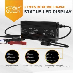 Power Queen 29.2V 20A LiFePO4 battery charger is specially designed for 12V LiFePO4 battery and applies the special 2-stage Constant Current/Constant Voltage (CC/CV) charging algorithm with practical Led indicators. This particular charger has a special 0V charging function, which enables the activation of the BMS System.