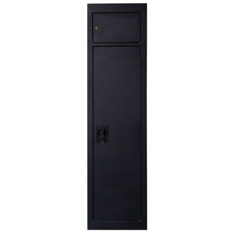 The gun safe has a 1mm steel door & 1mm body. It operates with 2 security keys. It has a shelf with a key and there are holes for the floor and the wall.